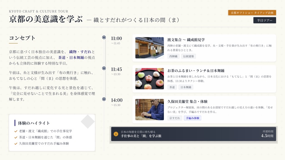 本ツアーでは、京都に息づく独自の美意識を「織物」や「すだれ」といった職人の手仕事(工芸)の視点だけでなく、「茶道」や「日本舞踊」という身体表現(芸道)の視点からも紐解きます。 モノづくりの背景にある精神性に多角的に触れることで、貴方のビジネスを彩る新たなインスピレーションをお届けします。